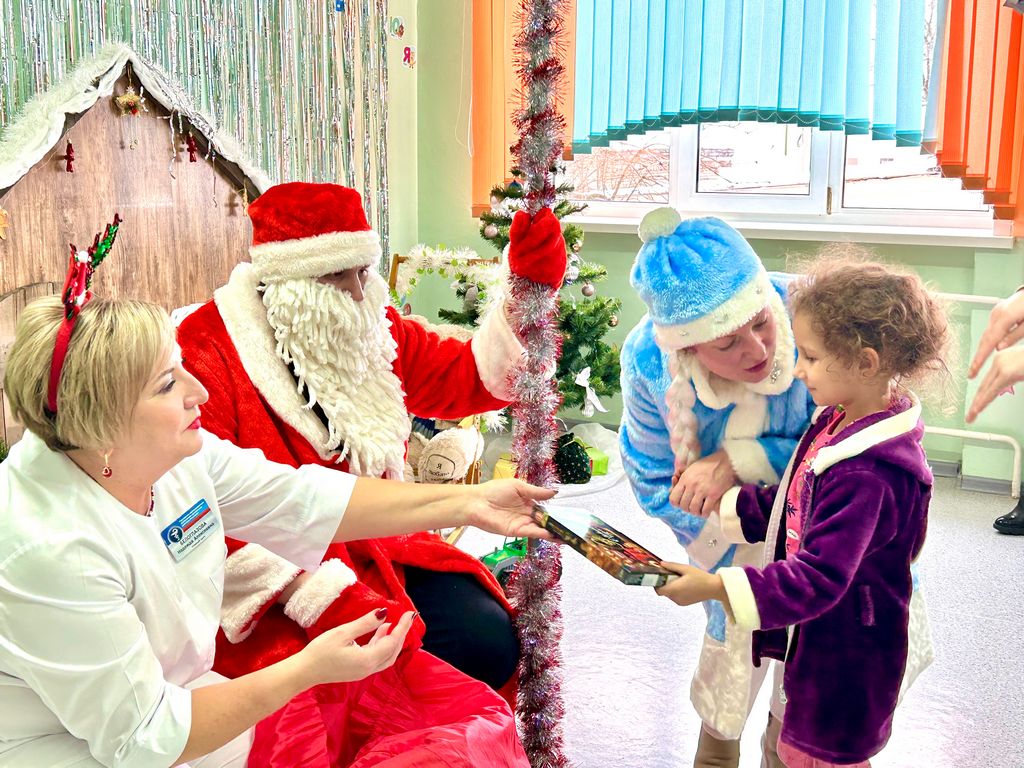 Дед Мороз и главный врач раздали детям конфеты, создавая атмосферу праздника и радости.